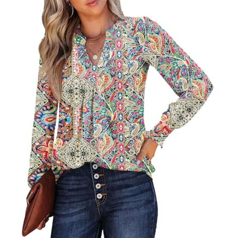 Rapbin Women's Puff Sleeve V-Neck Ethnic Print Blouse